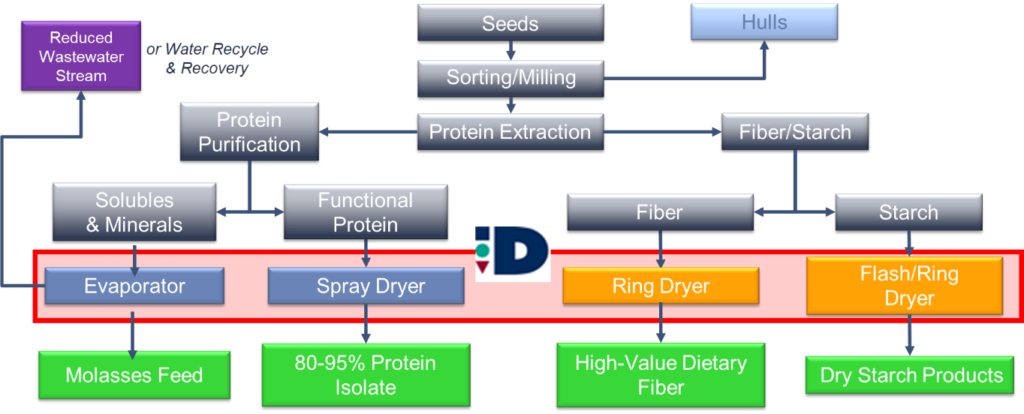 农产品:商品谷物加工商在散装谷物储存和处理方面有丰富的经验,包括碾磨和混合成特种面粉。为了进一步使产品多样化以包含高价值蛋白质,这种专业知识可以集成到干分馏工艺的前端。这些受资本支出限制的项目通常采用空气分类法进行分馏,但蛋白质浓缩能力有限,适用于(55%-65%)蛋白质浓缩物市场。通过一些技术创新,可能可以稍微提高蛋白质浓度。或者,制造商可以在湿法分馏工艺中投入额外的资本支出,在经验丰富的合作伙伴的技术支持下,直接进入更高价值的蛋白质分离物市场。
