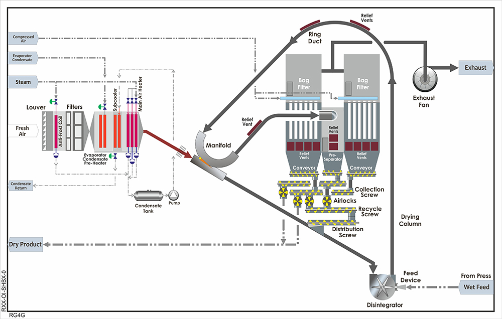 鱼尾给料器安装在热粉碎机一侧,将压缩后的谷朊粉沿其宽度均匀分布。鱼尾处设计了一个可拆卸的尖端,磨损时可以轻松更换或调整染料间隙。在环形干燥器中,歧管分级器可使环周的半干燥固体进行再循环以进一步干燥。歧管为无故障设计,可以从控制室远程调整叶片,因此操作员无需手动操作即可控制分级。