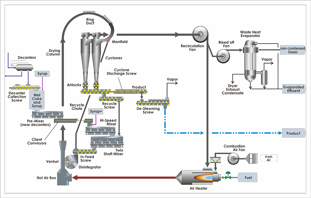 高蛋白DDG产品几乎完全可以使用狄德环形干燥器进行干燥,因为狄德在咨询工程、研发、产品测试、中试工厂验证和工艺设计等方面十分专业。在环形干燥器中,由于物料停留时间短,暴露在高温环境中的时间只有几秒钟,因此经过环形干燥后的产品相比于使用其他技术干燥的产品品质更高。环形干燥器的多功能设计可满足产品特性的变化,如含水量、蒸发量、产品成分等的变化,而这些变化可能会影响干燥过程。
