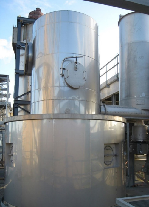干燥塔为立式圆筒,带有一个环形进气口和一个轴向转子。空气由送风机送入空气加热器,通常由直燃式燃气燃烧器加热,然后切向进入热空气入口增压室。该切向入口与转子共同作用使干燥室内产生涡流气流。